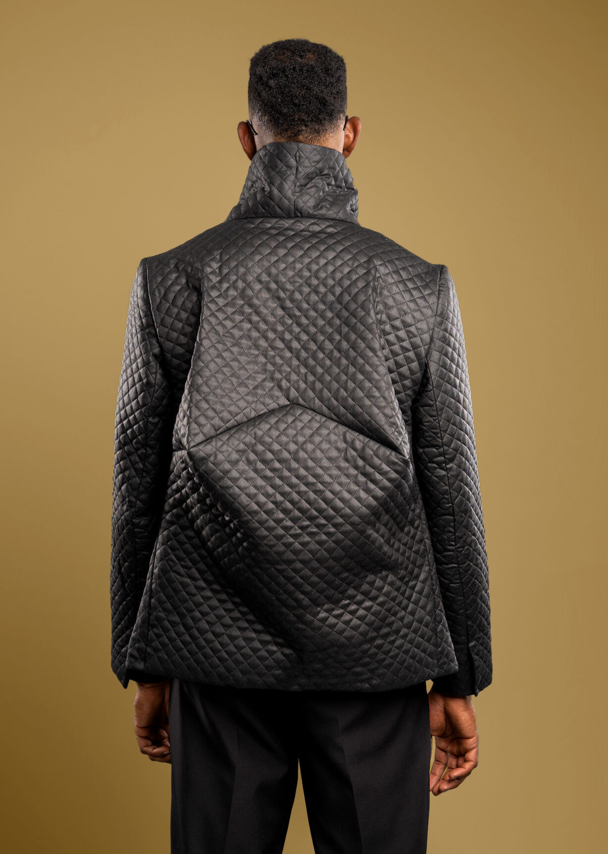 - Quilted geometric shell with sculpted back paneling for a futuristic silhouette